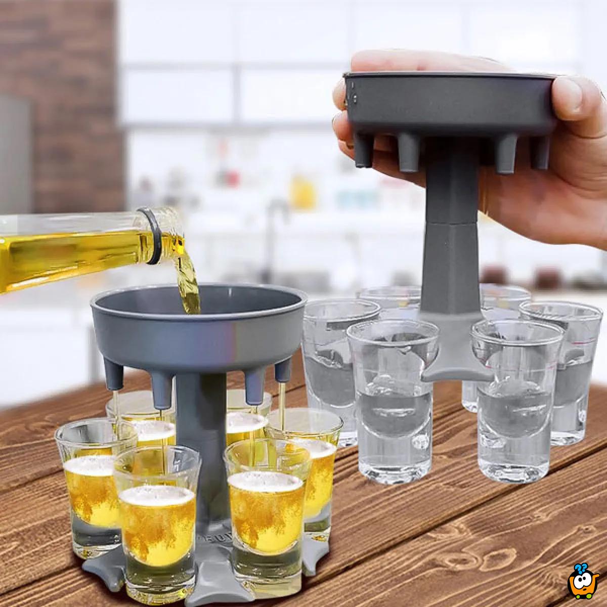 A evo kako to funkcioniše: Stavite čaše ispod onoga što Vam možemo opisati samo kao vime 😉 a zatim gore u činiju natočite alkohol po izboru. Šot dozator to tečno zlato rasporedi na sve čašice dolje i bum, gotovo, odmah imate šest šotova! Čaše dolaze u kompletu!