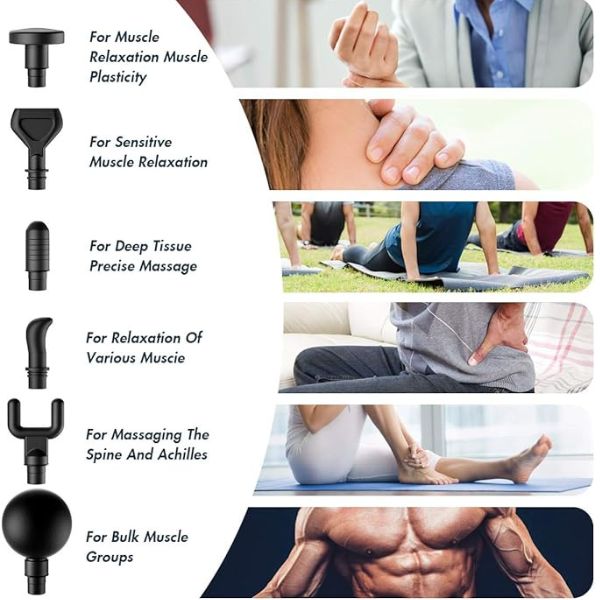 - Ppištolj za masažu opremljen je različitim nastavcima posebno prilagođenim određenim delovima tela, za najbolje rezultate: