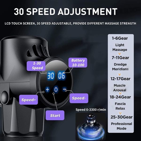 Pištolj za masažu ima 30 podesivih podešavanja brzine koje isporučuju do 1200-3200 udara u minuti što vam omogućava da postignete pravu i odgovarajuću količinu pritiska za ublažavanje bolova u mišićima. Ugrađeni motor visokog obrtnog momenta bez četkica, radna buka je samo 35dB-50dB, ultra tiha.
