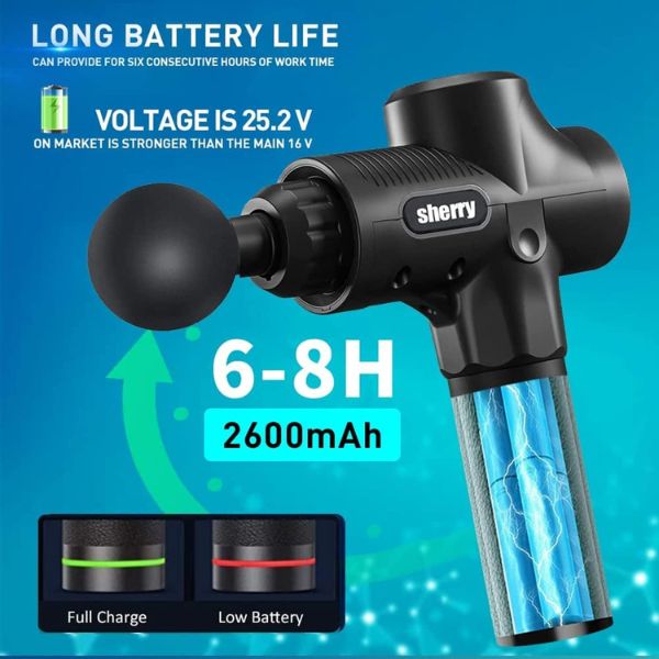 Pištolj za masažu mišića 2600mAh visokokvalitetna punjiva litijumska baterija, obezbeđuje 6 sati radnog vremena (niska brzina), potrebno je 1,5-2 sata da se potpuno napuni