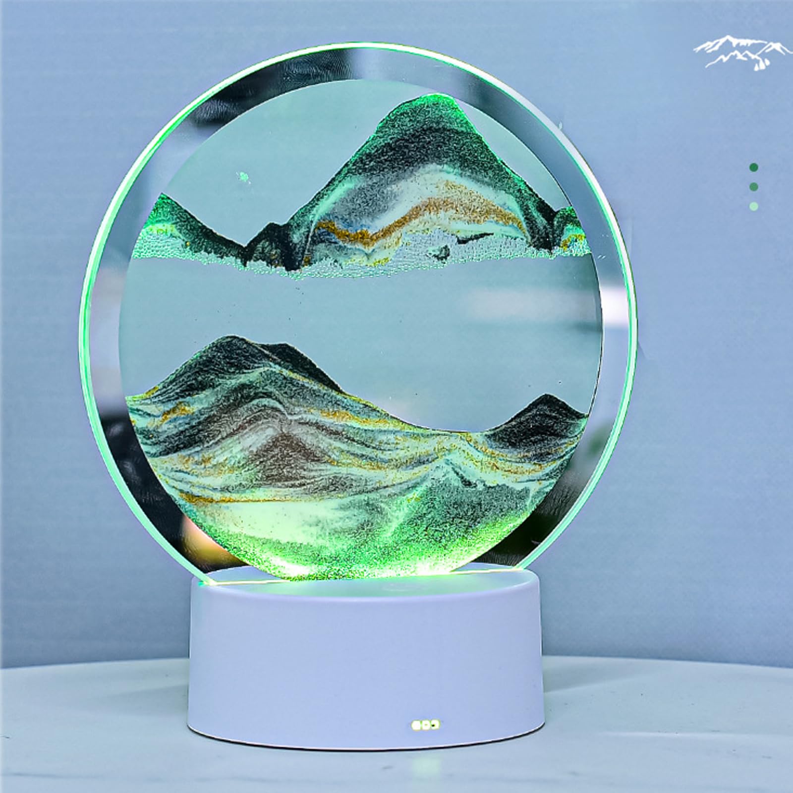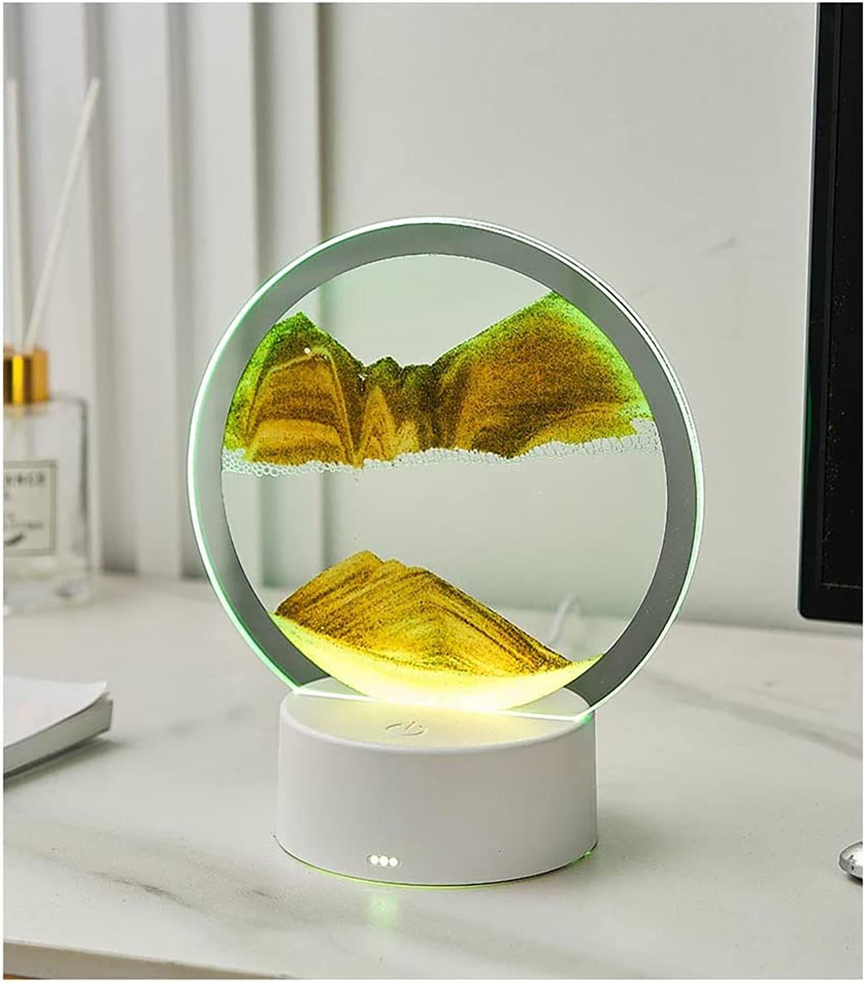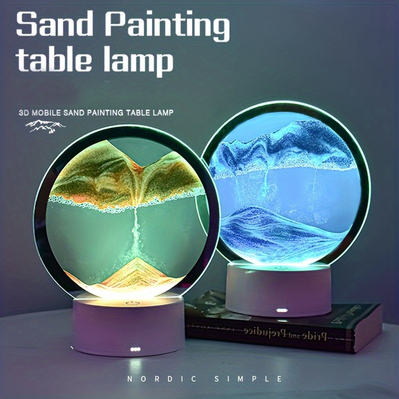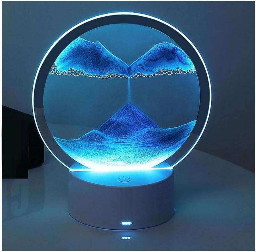 Ovaj proizvod je dinamički peščani ukras koji stvara različite pejzaže (pustinje, okeane, planine) svaki put kada se rotira. Osvetljen LED diodama, nudi ravnomernu svetlost bez treperenja, stvarajući prijatno vizuelno iskustvo. Izrađen je od visokokvalitetnog prozirnog stakla i okvira, promera 15cm. Ova pesak noćna lampa predstavlja savršen poklon, pružajući osećaj opuštanja i mira kroz svoje živopisne, pokretne pejzaže.